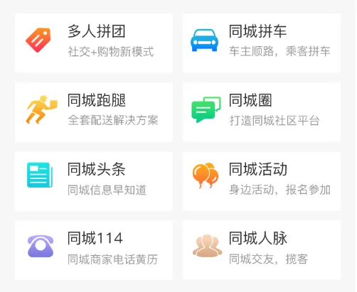 除8大核心模块外,还有同城拼车、同城跑腿、同城114、同城人脉、同城活动、同城人脉等特色模块,涵盖生活方方面面,一款产品满足生活所有需求。