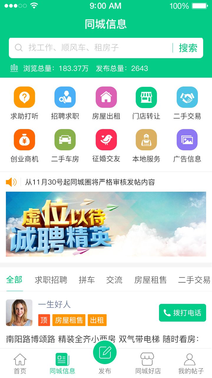 同城头条、求职招聘、房租租赁等本地信息,是一个信息交流平台,也是一个社交平台,为本地居民提供广阔的交流空间,用户注册后,可以在平台上寻求帮助或发表言论,也可以帮助别人。统优