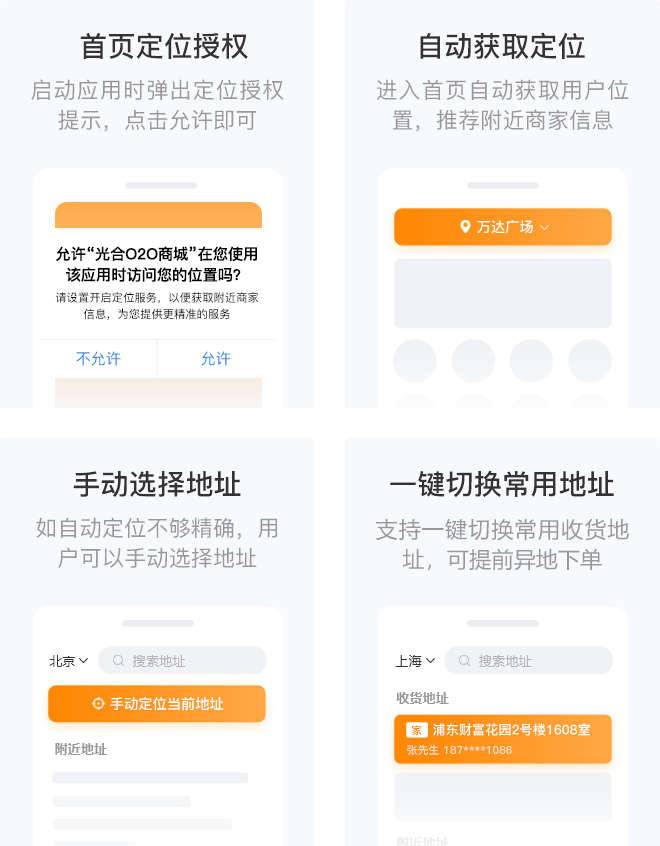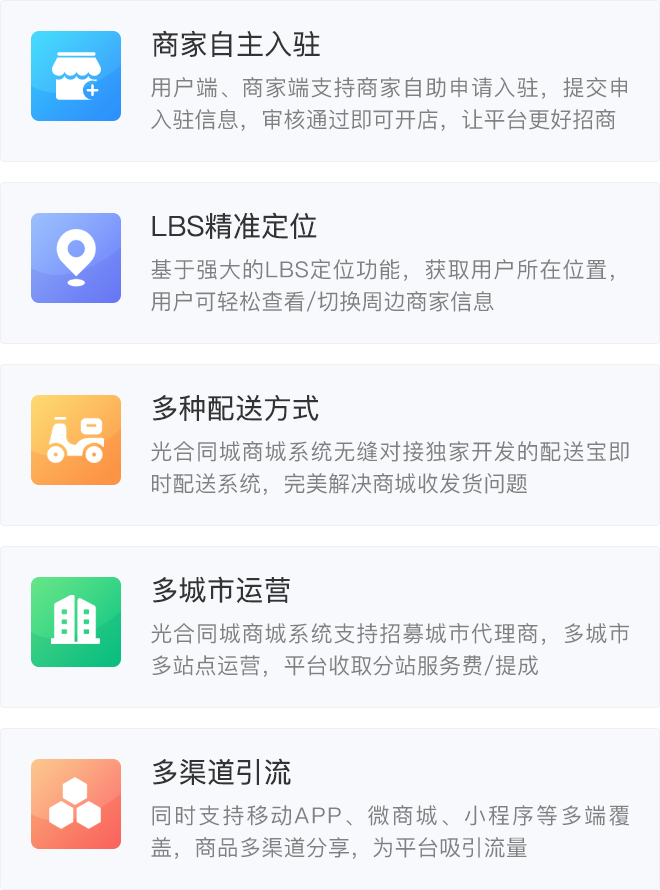 光合同城商城系统基于强大的LBS定位功能,获取用户当前位置,精准推荐附近的商品/商家,支持平台和商家设置配送费、配送范围,满足本地化同城即时配送需求。
