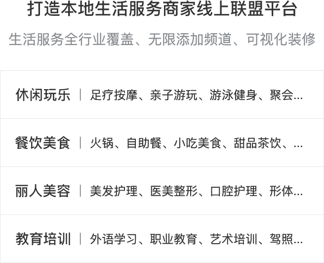光合同城好店系统支持无限添加行业频道,覆盖本地生活全行业。频道主页支持自定义装修,可视化编辑操作简单。